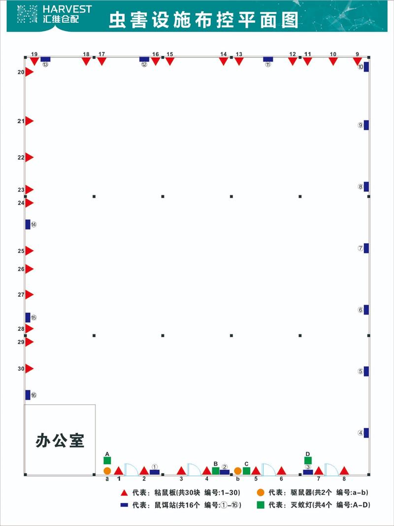 匯維新都倉庫存放產品主要以食品為主,作為專門的食品倉對蟲害防控要求嚴格,特設置布控圖全面防治倉庫蟲害。蟲害管理包含鼠控、爬蟲控制以及飛蟲控制,主要為對老鼠、蟑螂、蚊蠅的防控。